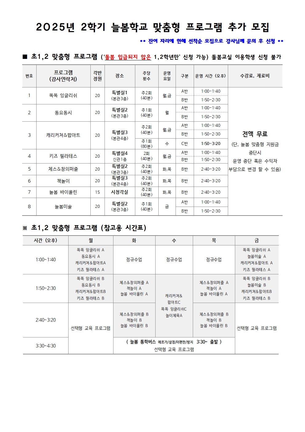 - 2025. 늘봄학교 2학기 맞춤형 프로그램 수강생을 추가 모집합니다.